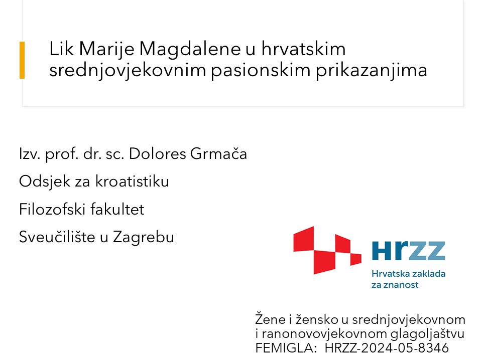 Na kolokviju je održala izlaganje Lik Marije Magdalene u hrvatskim srednjovjekovnim pasionskim prikazanjima, posvećeno predodžbi o Magdaleni sadržanoj u glagoljskim izvorima pasionske provenijencije.