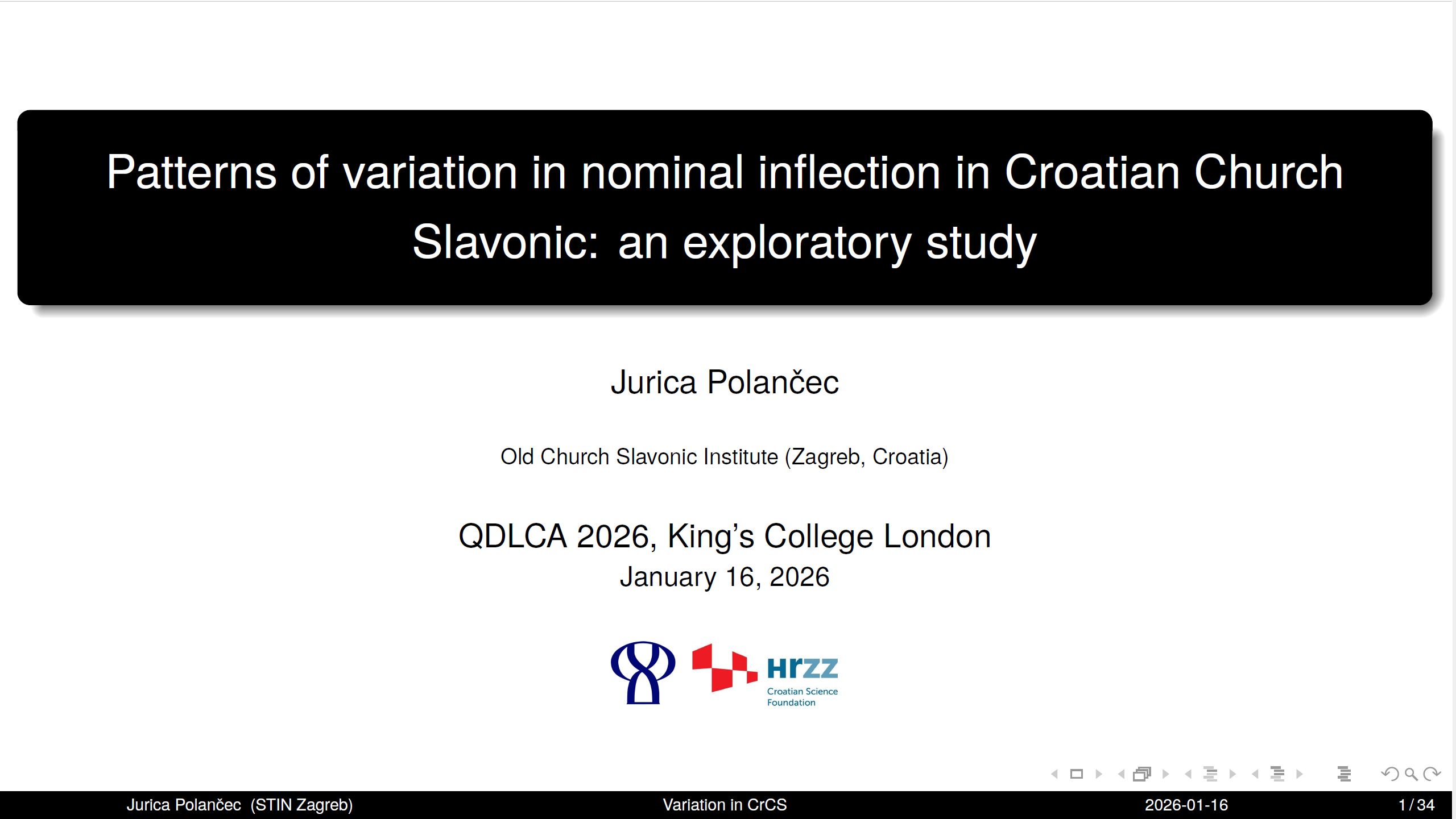 Na njoj je održao izlaganje pod naslovom Patterns of variation in nominal inflection in Croatian Church Slavonic: An exploratory study, u kojemu je predstavio korpusno istraživanje o imenicama a-sklonidbe ženskoga roda u hrvatskom crkvenoslavenom jeziku.